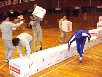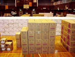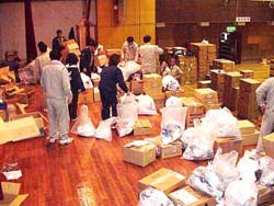 体育館に積み上げられる物資
