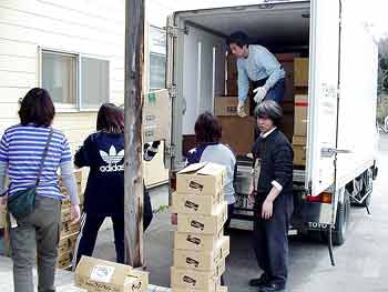 | 5月1日、学研(株)から寄贈を受けた1,5トンものおもちゃと 教材、学習雑誌などを満載したトラックが豊浦の避難所回りを しました。 トラックは虻田町温泉町の魚屋さん宍戸さんの所有するもので、 運転手は被災者の宍戸さん。 宍戸さんは噴火後まだ一度も帰宅していません。 地元豊浦町でパソコンショップを営む小西さんをコーディネー ターに、伊達市ボランティアセンターのボランティア3名と、 元気都市安藤さん、有珠山ネット冨田の6名が回りました。 一番小さな避難所から順番に回って、子供たちとご両親に直接 手渡すことができました。 教育委員会に図鑑の山がありますので、先生、取りに言ってね。 早い者勝ちです!! 学研さん。子供たちは大喜びでした。どうもありがとう。 |
