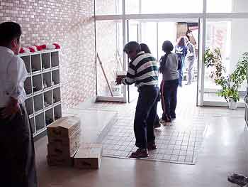 | 豊浦小学校の中にある虻田小学校 | 学習雑誌と付録の山 | 大まかに仕分け作業をしました |